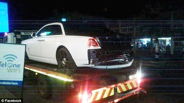 Pictures showing the eye-catching black and white Rolls Royce Ghost series II on the back of a pick up truck reveal the luxury car must have been hit hard from behind during the pile up.