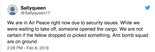 Corporate Communications Manager of Air Peace, Iwarah said: “We are sincerely grateful to all our wonderful guests on board Flight 7138 for their support, patience and cooperation throughout the precautionary security checks conducted by Explosive Ordinance Disposal (EOD) squad, Federal Airport Authority of Nigeria (FAAN) Aviation Security (AVSEC) and our security team after suspected thieves opened the cargo hold of our aircraft holding for departure on Runway 18R (A1) of the Murtala Muhammed Airport, Lagos at about 7.35pm on Thursday, February 08, 2018.