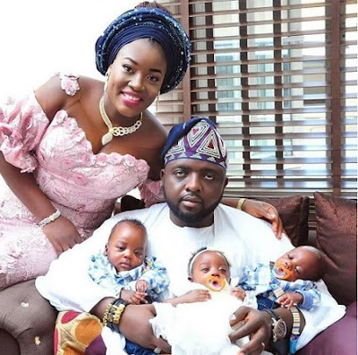 “My mouth is filled with laughter and lips with shouts of joy. After my 3rd year of trying to conceive, i started confessing that i want triplets (2boys & 1girl). Permit me to present to u Oluwatumininu(girl), Oluwatimilehin & Oluwatomisin Adedeji. ???my heartbeat. @asiwajufa thank you for the 6years of waiting. U stood by me gidigba..”.