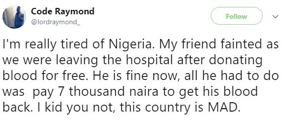 FeaturesNewsTop Stories Man Forced To Pay N7k To Get Back His Blood He Just Donated After Collapsing By Ebube Grace - June 4, 2018 0 654 FacebookTwitterPinterestWhatsApp A Nigerian man has been reportedly forced to pay as much as N7,000 to get back the blood he donated to a hospital, after he fainted just moments after donating. The story was told by one Code Raymond on social media;
