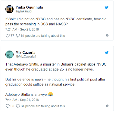 NewsPoliticsTop Stories How People React To Adebayo Shittu Skipping NYSC By Ebube Grace - September 21, 2018 0 556 FacebookTwitterPinterestWhatsApp The Minister of Communications, Adebayo Shittu, failed to participate in the NYSC scheme despite graduating from the then University of Ife (now Obafemi Awolowo University, OAU) at age 25. He said he thought he didn’t need it. Below are a few reactions from Nigerians online;