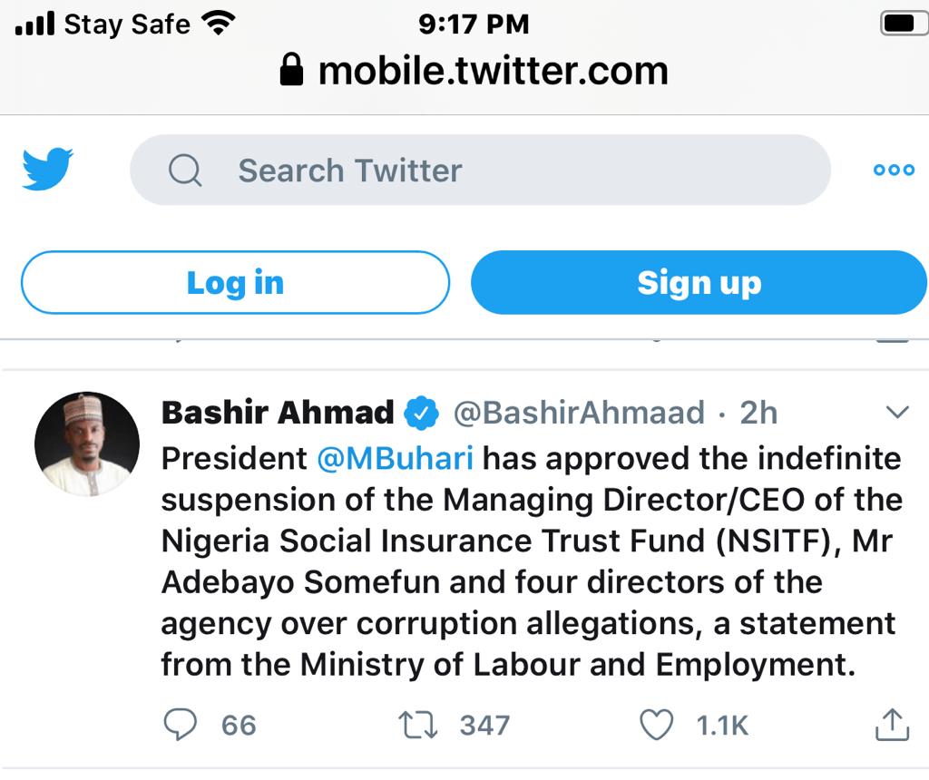 The suspension was further confirmed by the Special Adviser to President Buhari on New Media, Mr. Bashir Ahmad on his twitter handle.