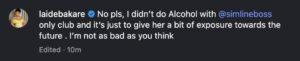 In another post, she added, “No please, I didn’t do alcohol with @simlineboss, only club, and it’s just to give her a bit of exposure towards the future. I’m not as bad as you think.”