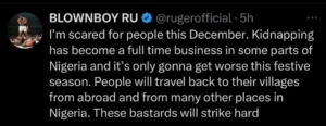 In a tweet on X, Ruger highlighted the rising wave of kidnappings across the country, particularly during high-travel periods like Detty December.