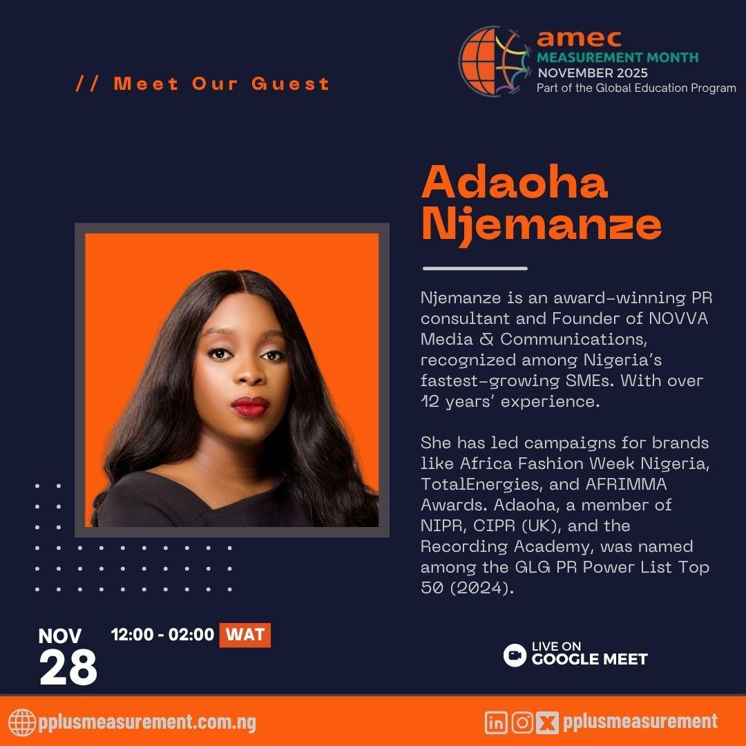 P+ Measurement Services, Nigeria’s leading independent media intelligence and PR measurement agency, will proudly host the 2025 edition of AMEC Measurement Month in Nigeria on Friday, November 28, 2025, from 12:00 p.m. to 2:00 p.m. (WAT) via Google Meet.