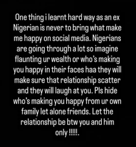“One thing I learnt the hard way as an ex-Nigerian is never to bring what makes me happy on social media.”