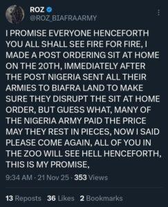 C‑ROZ wrote: “I promise everyone henceforth you all shall see fire for fire. I made a post ordering sit at home on the 20th. Immediately after the post, Nigeria sent all their armies to Biafra land to make sure they disrupt the sit at home order.