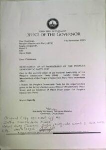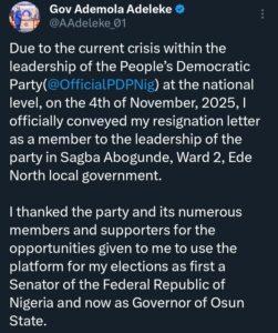 He wrote: “Due to the current crisis within the leadership of the People’s Democratic Party (@OfficialPDPNig) at the national level, on the 4th of November, 2025, I officially conveyed my resignation letter as a member to the leadership of the party in Sagba Abogunde, Ward 2, Ede North local government.