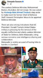 “The useless Defence Minister, Mohammed Badaru Abubakar, did not resign. He was asked by AAsiwaju Bola Ahmed Tinubuto step aside to make room for former Chief of Defence Staff, General Christopher Musa to be appinted Defence Minister.