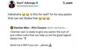 “I, Damian Wan, am ready to give any pastor the sum of one million naira to help us set the great legend 2Baba free. If you can do it, please send me a DM.”