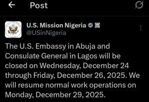 In the tweet dated December 23, 2025, it was announced that the Lagos consulate and US Embassy in Abuja will be closed effective December 24, 2025.