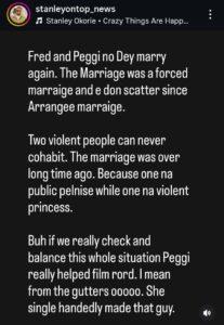 Fred and Peggy no dey marry again. The marriage was a forced marriage and e don scatter since arrangee marriage.Two violent people can never be a cohabit The marriage was over long time ago.