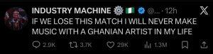“If we lose this match, I will never make music with a Ghanaian artist in my life,” he wrote.